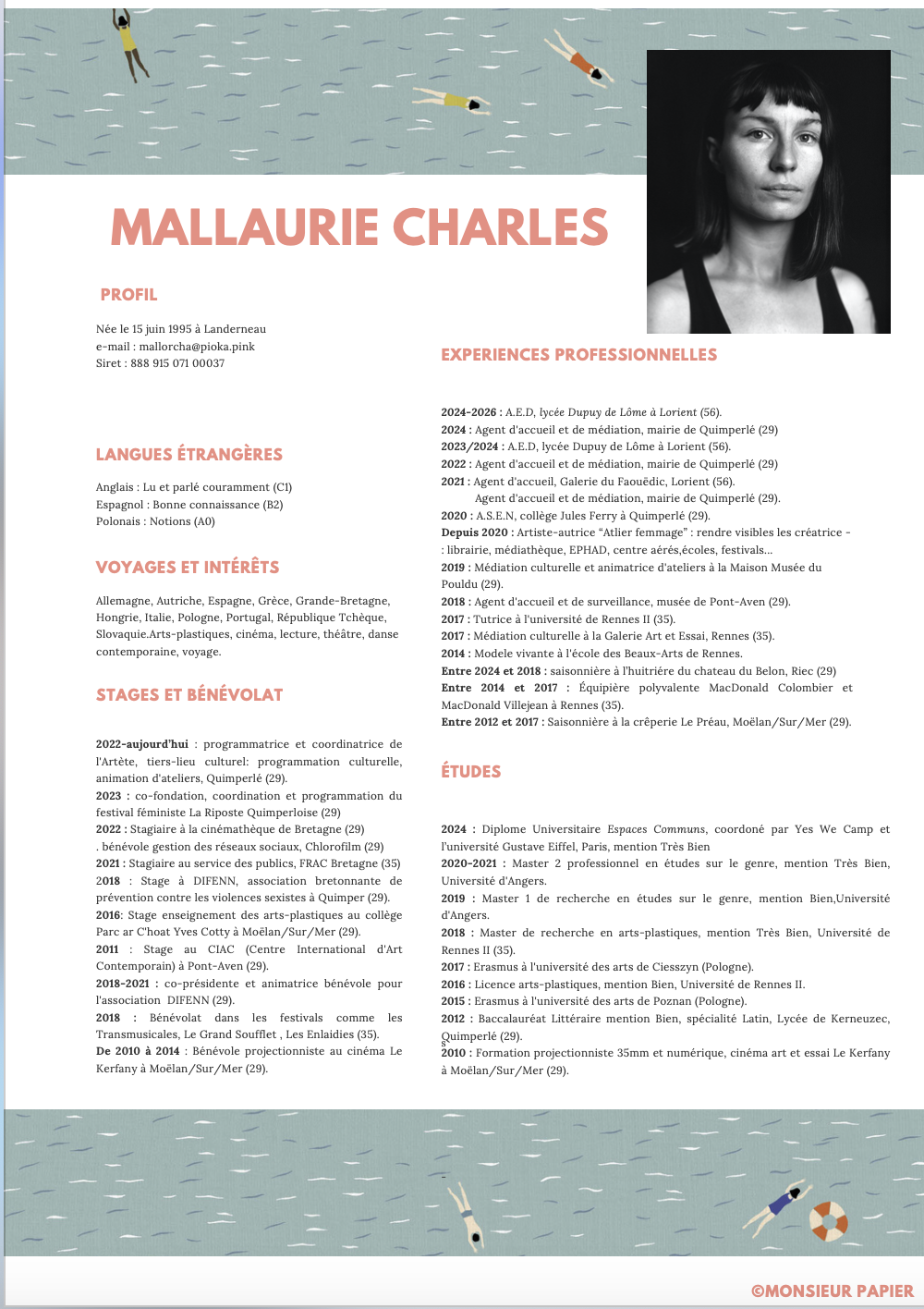 Apres un stage au service des publics du Frac Bretagne ainsi qu’un stage a la cinematheque de Bretagne, j’écris mon mémoire de master 2 intitulé “ Institution culturelle et politique d’inclusion des genres : l’exemple du Frac bretagne” sous la direction de Sylvain Villaret.