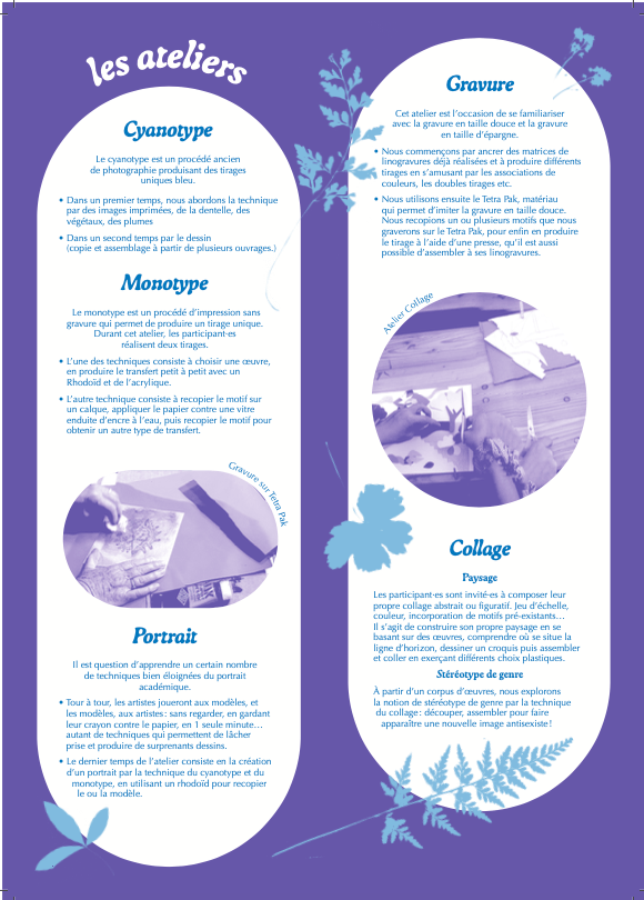 Chaque atelier dure 2h30 et démarre par une présentation des participant · es avec une introduction sur la technique et les créatrices l’ayant utilisé. Il est possible d’adapter l’atelier à une demande, une thématique ou un sujet précis. Chaque participant · es repart avec une fiche méthode, permettant de refaire l’atelier chez soi, ainsi qu’avec leur production artistique.